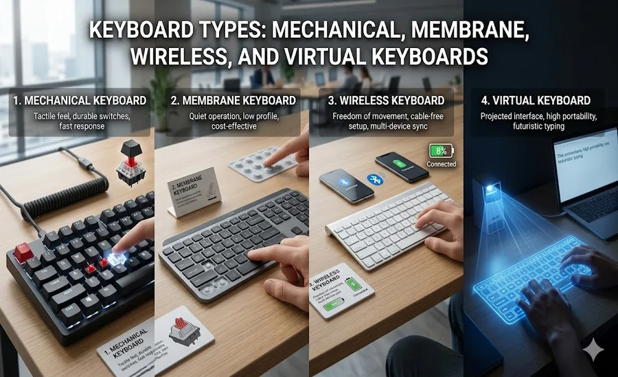Mechanical keyboards are known for their high performance and durability, making them popular among gamers and professionals. Membrane keyboards focus on simplicity and affordability, making them ideal for everyday users. Wireless keyboards offer flexibility and a clean setup by eliminating cables, while virtual keyboards provide a touch-based typing experience on mobile devices. Each type has its own strengths and limitations, which means there is no single “best” keyboard for everyone.